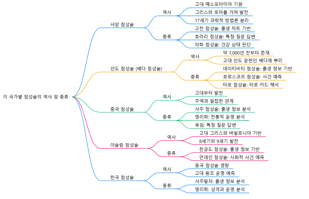 • 역사: 한국의 점성술은 중국 점성술의 영향을 받았으며, 고대부터 왕조의 운명을 예측하는 데 사용되었습니다. 현대에는 개인의 운명을 분석하는 다양한 방법이 발전하였습니다.