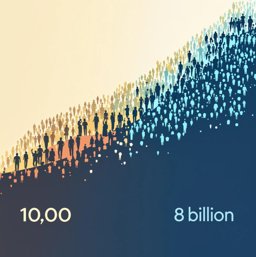 2022년 11월, UN은 세계 인구가 공식적으로 80억 명을 넘어섰다고 발표했습니다. 인류가 10억 명에 도달하는 데 약 20만 년이 걸렸지만, 70억에서 80억으로 증가하는 데는 단 12년밖에 걸리지 않았습니다. 이는 만년전부터 전세계 인구의 변화 패턴에서 가장 급격한 증가세를 보여줍니다.