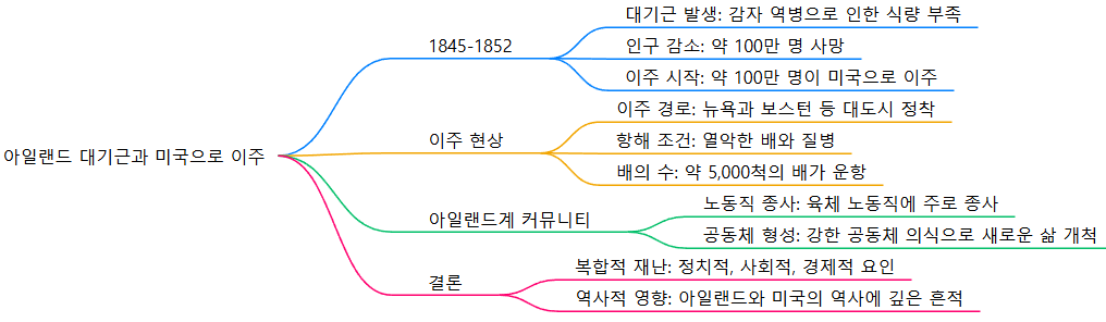 아일랜드 대기근(1845-1852)은 아일랜드 역사에서 가장 비극적인 사건 중 하나로, 이 시기에 약 100만 명이 사망하고, 또 다른 100만 명 이상이 미국을 포함한 해외로 이주하게 되었습니다. 이 대기근의 주요 원인은 감자 역병으로, 아일랜드 인구의 대부분이 감자에 의존하고 있었기 때문에 심각한 식량 부족을 초래했습니다.