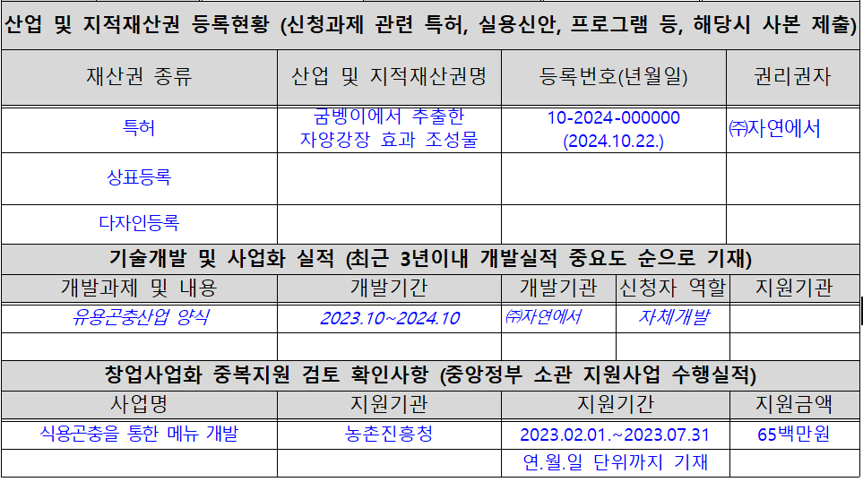 지적재산권등이 있으면 좋어 주시고 없으면, 해당사항 없음으로 놔두시면 되고, 기술 개발 사업화 실적이 있으면 넣어 주시고 없으면, 놔두시면 됩니다.