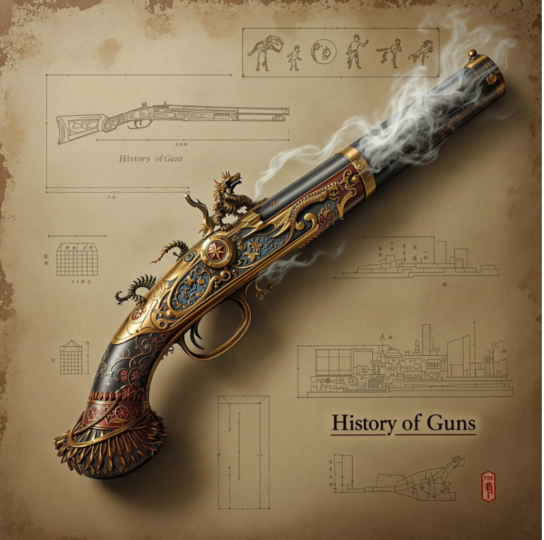 중국 송나라 시대(1132년)에 최초로 화약이 발명된 이후, 진정한 의미의 총기는 1288년 저장성에서 처음 등장했습니다. 죽통에 화약을 넣고 발사하는 단순한 형태였지만, 이는 인류 역사상 최초의 화기였습니다.