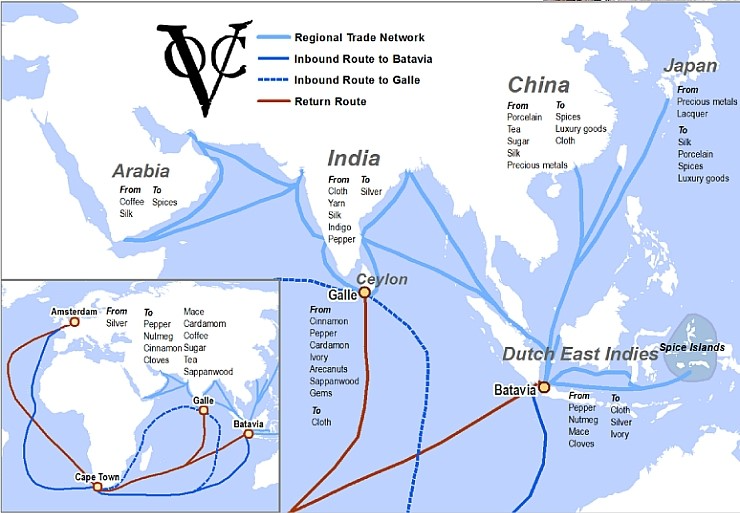 - 무역과 식민지 경영: VOC는 아시아에서의 무역을 통해 큰 성공을 거두었으며, 특히 인도네시아 지역에서 많은 영토를 직접 지배하거나 현지 제휴 세력을 통해 통제했습니다. 이 과정에서 VOC는 자카르타(바타비아)를 주요 거점으로 삼고, 향신료, 차, 커피 등 다양한 상품을 유럽으로 수출했습니다.